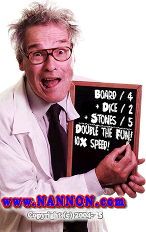 Now, after 5000 years, the problem has been solved! NANNON was discovered in 2004 by a computer scientist searching for the simplest rules for a dice racing game with the most turnabout. The result? An instant classic game which, like TicTacToe or Dots, takes only minutes to learn and play. However optimal strategy is quite subtle and difficult to completely master, especially when playing for stakes with the Doubling Cube.